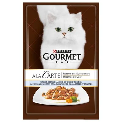 Gourmet A La Carte creations will make your cat purr with delight. Fine, delicate cuts of fish or meat, carefully cooked and combined with select ingredients, such as vegetables, rice and pasta pearls, creating a succulent world of textures and flavours.