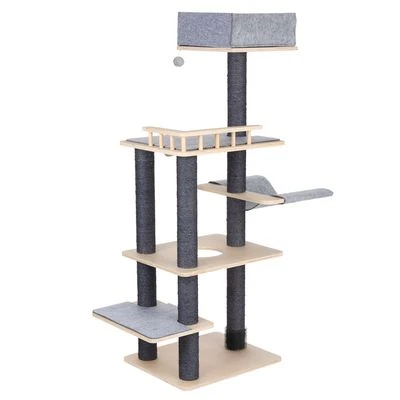 Stable cat scratching tree with long sisal posts and contrasting colours, featuring a lookout platform, hammock and comfortable bed, covered with robust artificial felt upholstery.