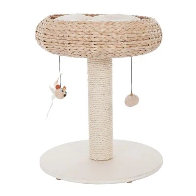 Small is beautiful and the Natural Home I cat tree is a very special cat tree. It has a raised cat basket made from elegant water hyacinth. The basket has a very soft, plush-covered cushion and is perfect for those lazy moments. This little cat tree has a solid wood base so it is very stable and will not tip over, even when your cat sharpens its claws on the sisal-covered post. And to complete the picture, there are two cute little plush toys dangling from the basket.