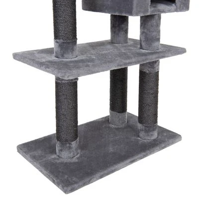 Robust scratching tree in an elegant grey, ideal for larger breed cats and with 3 padded sleeping areas and platforms, with a large cuddle bed and den, as well as a swivelling hammock.