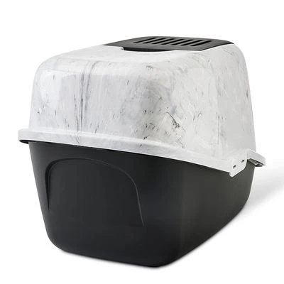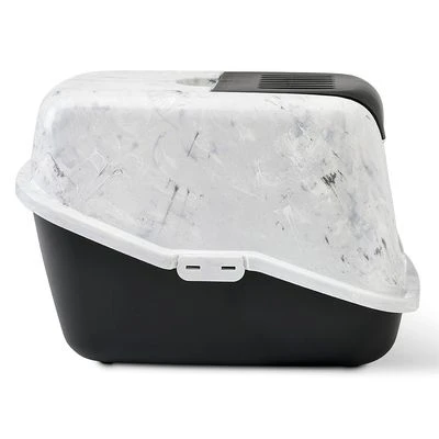Closed litter tray in noble marble look, large swinging door, bonnet securely fastened with clips & easily removable, practical carrying handle, with activated carbon filter, dimensions: L 56 x W 39 x H 38.5 cm