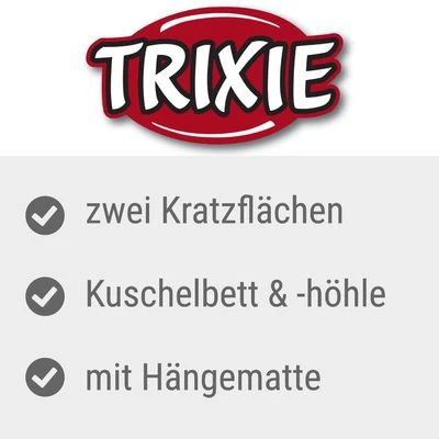 Would you like the cave? At a medium height and with two entrances, it is not only suitable for hiding, but also invites playful defence against curious conspecifics. Otherwise, the play ball dangling from the top platform provides good entertainment. A highlight of the Trixie Junior Pepito cat tree is the hanging lounger, where they can sink with pleasure and from where they can have a good view of their new territory. The most comfortable place, however, is at the top: a cosy, softly upholstered cuddly bed with a large lying surface and raised edge theoretically offers enough space for two growing house cats and their healthy sleep – if they want to share it.